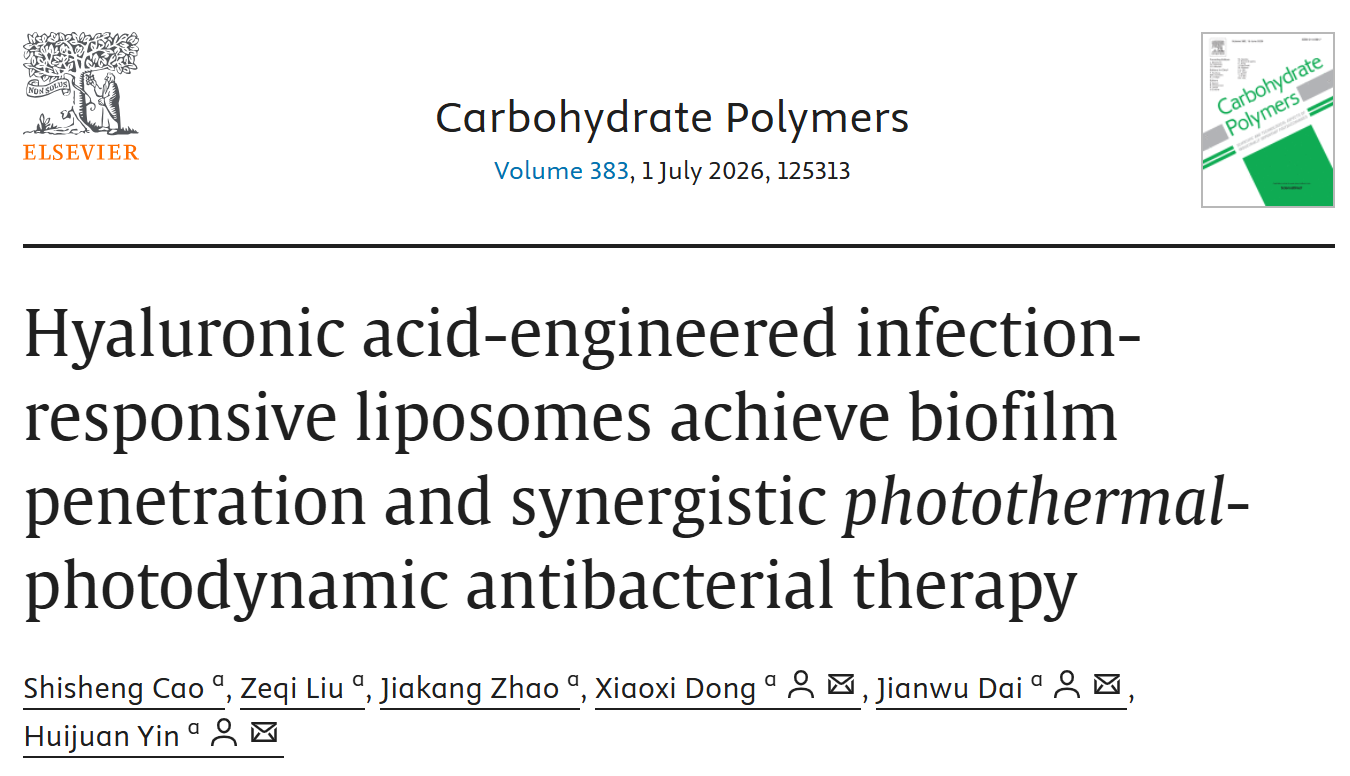 Shisheng Cao, Zeqi Liu, Jiakang Zhao, Xiaoxi Dong, Jianwu Dai, Huijuan Yin. Hyaluronic acid-engineered infection-responsive liposomes achieve biofilm penetration and synergistic photothermal-photodynamic antibacterial therapy. Carbohydrate Polymers,2026,383:125313.