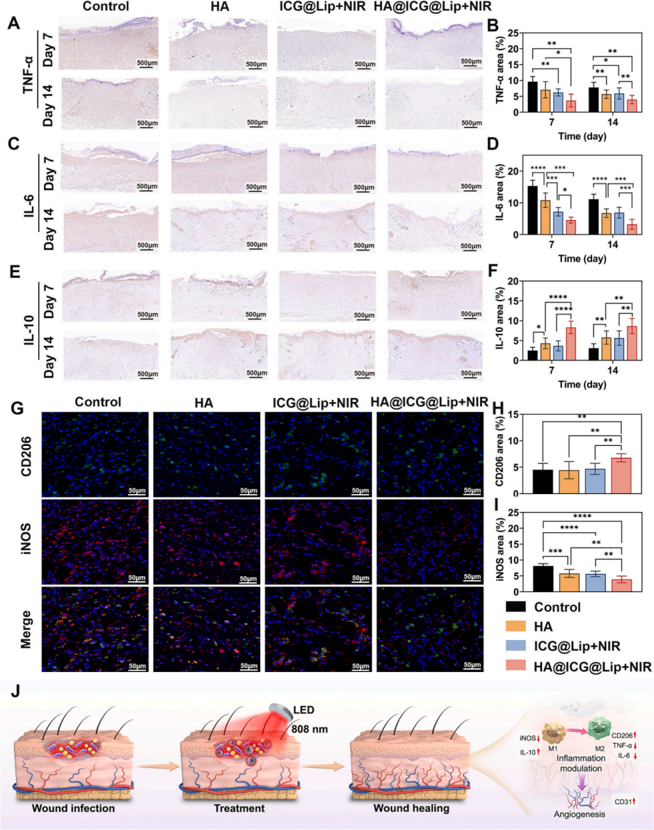 图5:HA@ICG@Lip结合 808 nm LED 照射可促进感染伤口愈合并调节炎症反应。