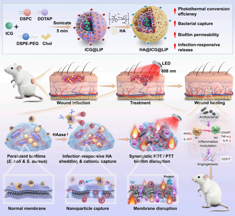 图1:HA@ICG@Lip纳米平台设计的示意图及其感染响应性抗菌机制,包括透明质酸酶触发的去屏蔽、增强的生物膜穿透、细菌捕获以及协同光热/光动力治疗。