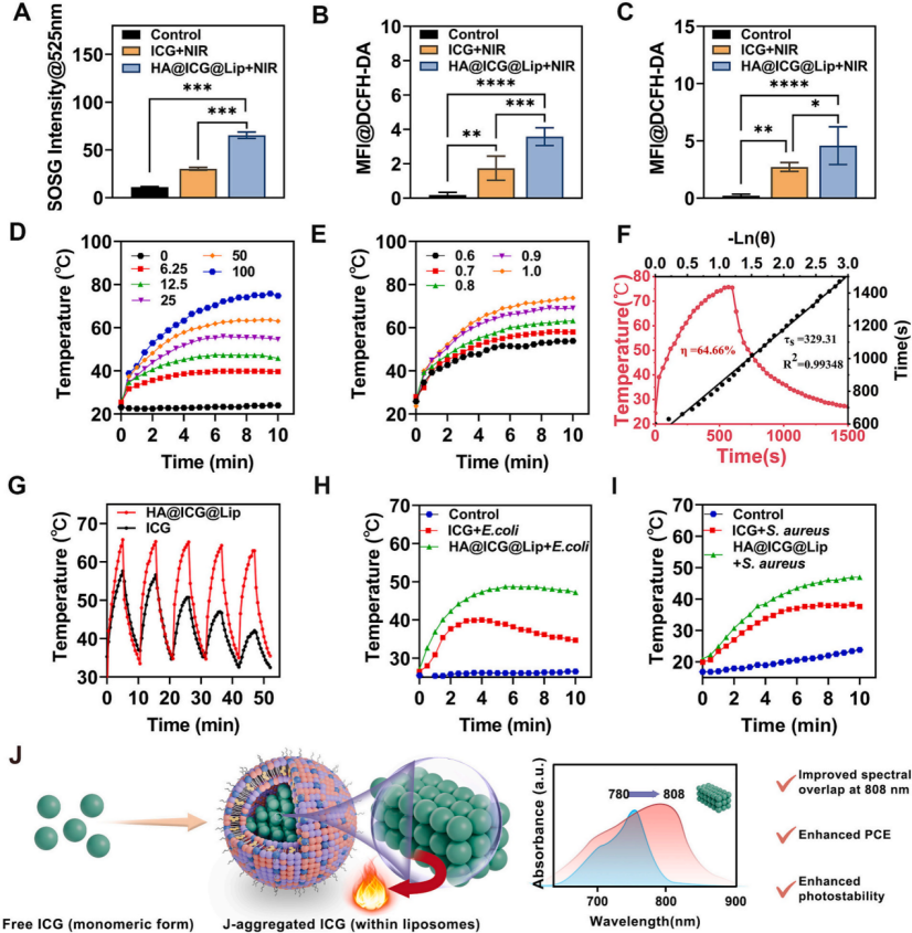 与此同时,研究团队还发现,吲哚菁绿(ICG)在脂质体微环境中形成了J聚集结构,可增强近红外吸收并提高光热转换能力,为后续光疗增效提供了材料基础。