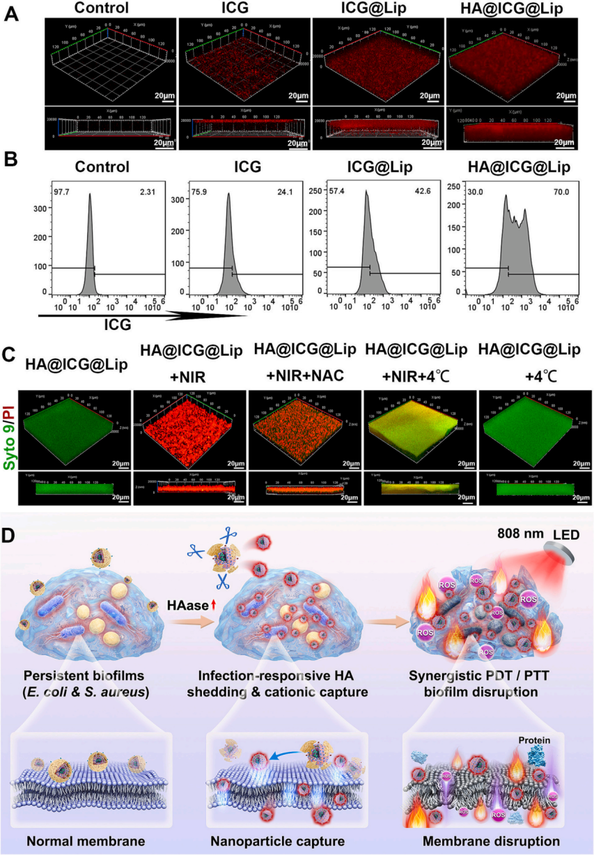 体外生物膜研究表明,HA@ICG@Lip 可在大肠杆菌和金黄色葡萄球菌混合生物膜中发生 HA 外壳的特异性降解,暴露带正电的脂质核心,从而增强细菌黏附与局部富集。经 808 nm 光照后,该体系同步产生活性氧和局部高热,诱导 PDT/PTT 协同效应,显著破坏细菌细胞膜及生物膜结构,最终实现细菌杀灭和生物膜解体